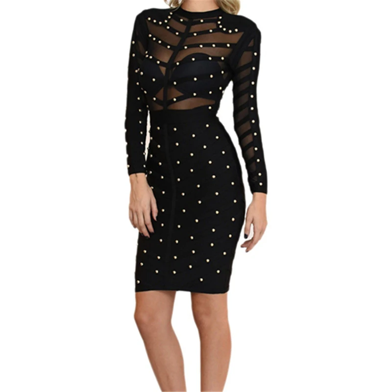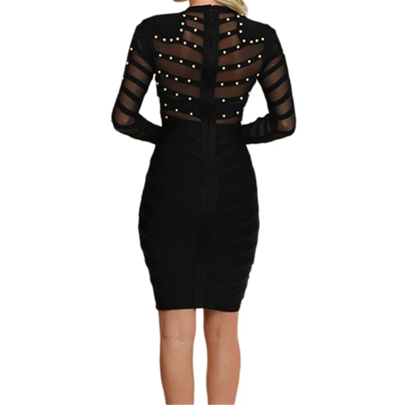 High Neck Inspired Long Sleeve Bandage Knee Dress with Pearls